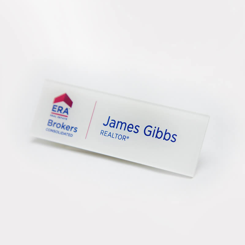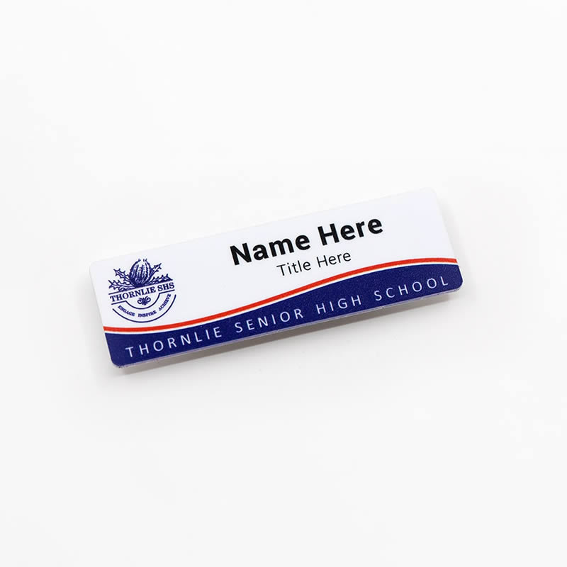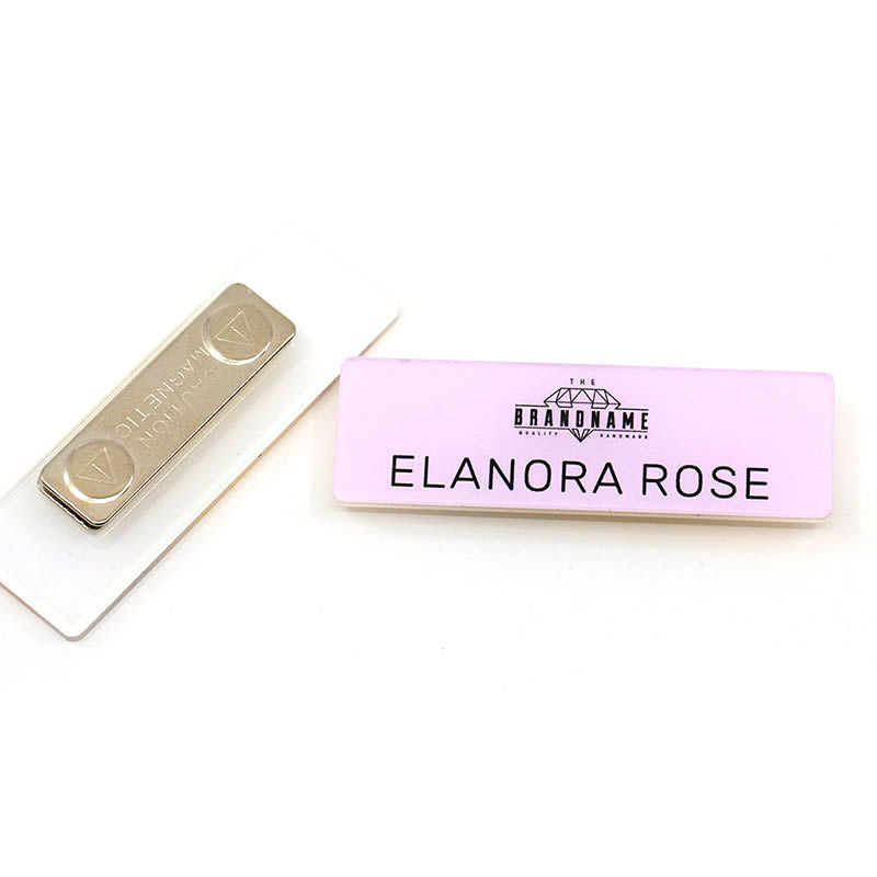 Acrylic name badges: Lightweight and clear (or colored), perfect if you want a modern, clean design. It’s easy to print on and looks great for retail staff, schools or creative businesses.